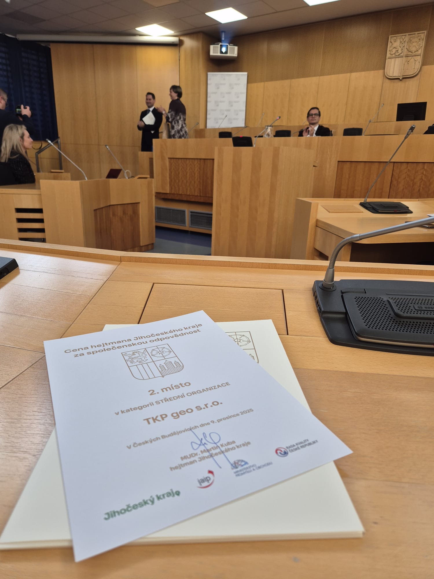 Včera jsme se účastnili předání Ceny hejtmana Jihočeského kraje za společenskou odpovědnost. Soutěž oceňuje firmy, instituce a neziskové organizace za jejich pozitivní dopad na společnost a udržitelnost. Potěšilo nás, že jsme obdrželi 2. místo v kategorii STŘEDNÍ ORGANIZACE a doufáme, že budeme inspirací pro další firmy.