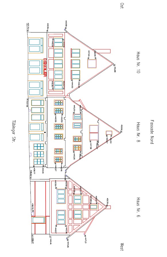 Naše společnost byla poptána na zajímavou zakázku zaměření a tvorby dokumentace tří budov v historickém centru města Herrenberg v Bádensku-Württembersku poblíž Stuttgartu. Prostřední objekt na adrese Tübinger Strasse 8 pochází ze 17. století a je památkově chráněný. Jedná se o dvoupodlažní hrázděnou stavbu s omítanou fasádou, postavenou na masivním přízemí. Objekt má typické předsazené stropní konstrukce a sedlovou střechu rozdělenou do tří úrovní podkroví.